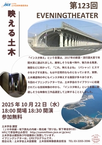 (2025.9.30)ポスター画像を掲載いたしました。 「インスタ映え」という言葉は、2017年の新語・流行語大賞で年間大賞に選ばれました。美味しそうな食べ物や、魅力ある風景、施設などに向かって、「これ、バエるよね」(カシャッ)とスマホをかざす光景も、もはや日常的なものとなっています。実際、土木構造物の中にもインスタ映えする施設が数々あります。今回のイブニングシアターでは、土木学会のライブラリーに収蔵されている技術映像の中から、「インスタ映え」という言葉に関連しそうな映像を三作品選定して上映することとしました。 ■詳細