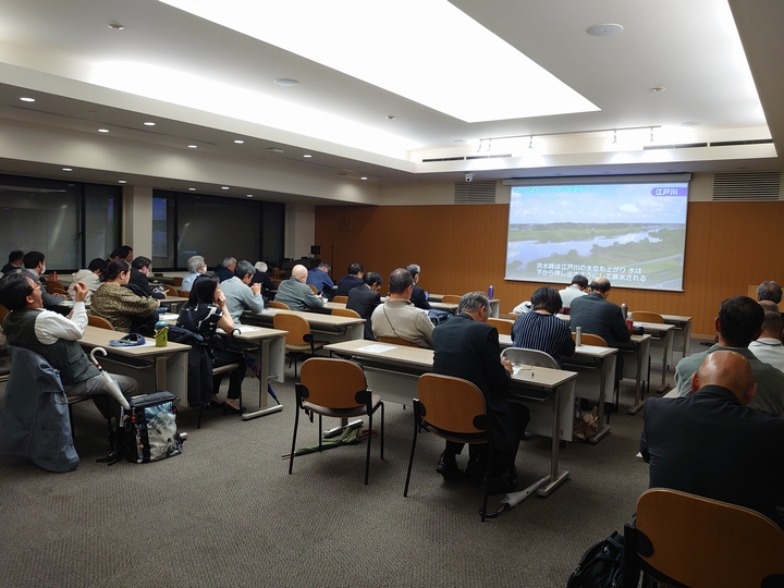 開会前の待ち時間には、初の試みでしたが、国土交通省関東地方整備局江戸川河川事務所提供の「首都圏外郭放水路」、稚内観光協会提供の「北防波堤ドーム」および、当委員会委員が撮影・編集した「伊王島大橋」をご覧いただき、今回「~映える土木~」に選んだ3つの施設の魅力を感じていただきました。