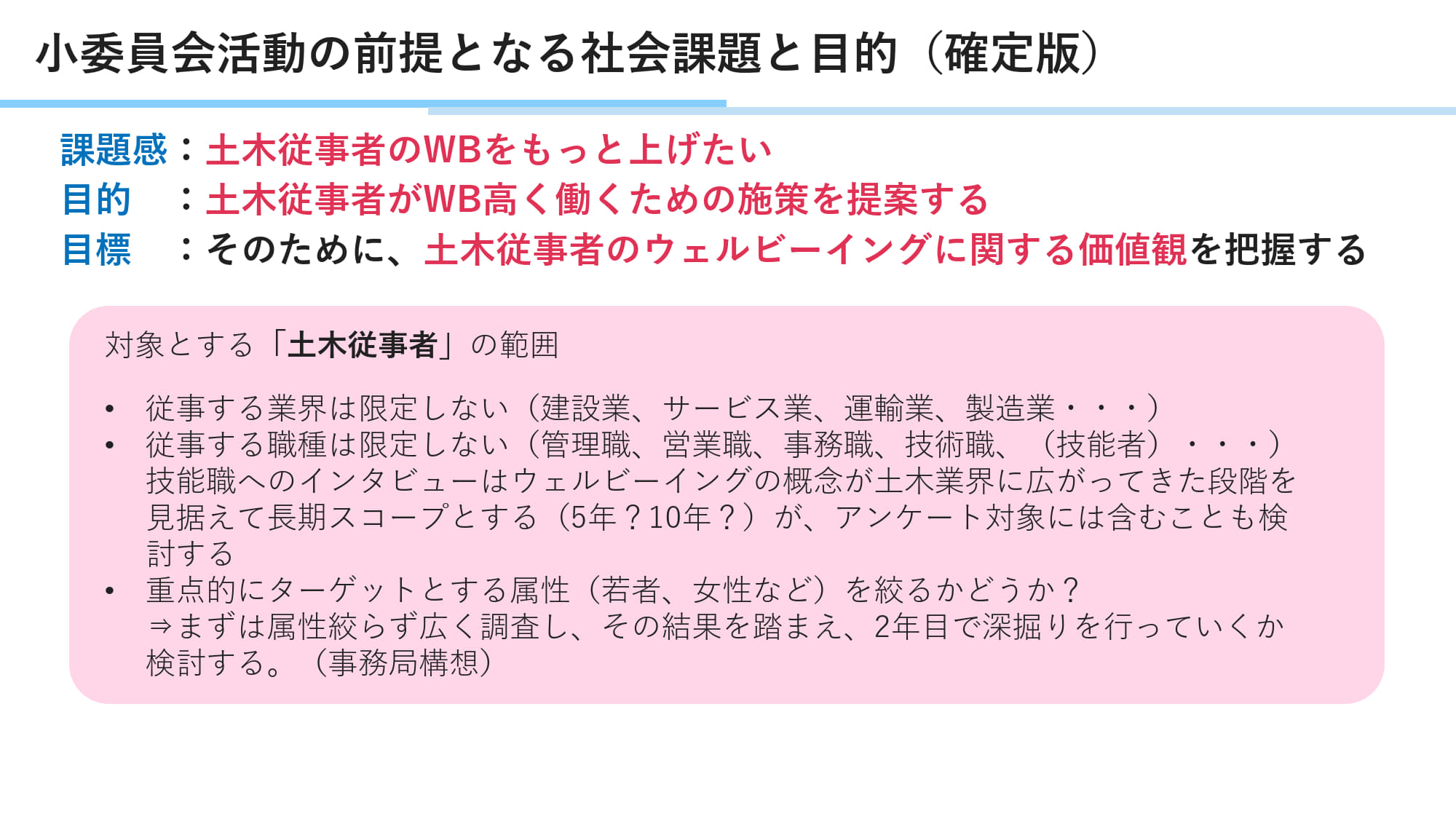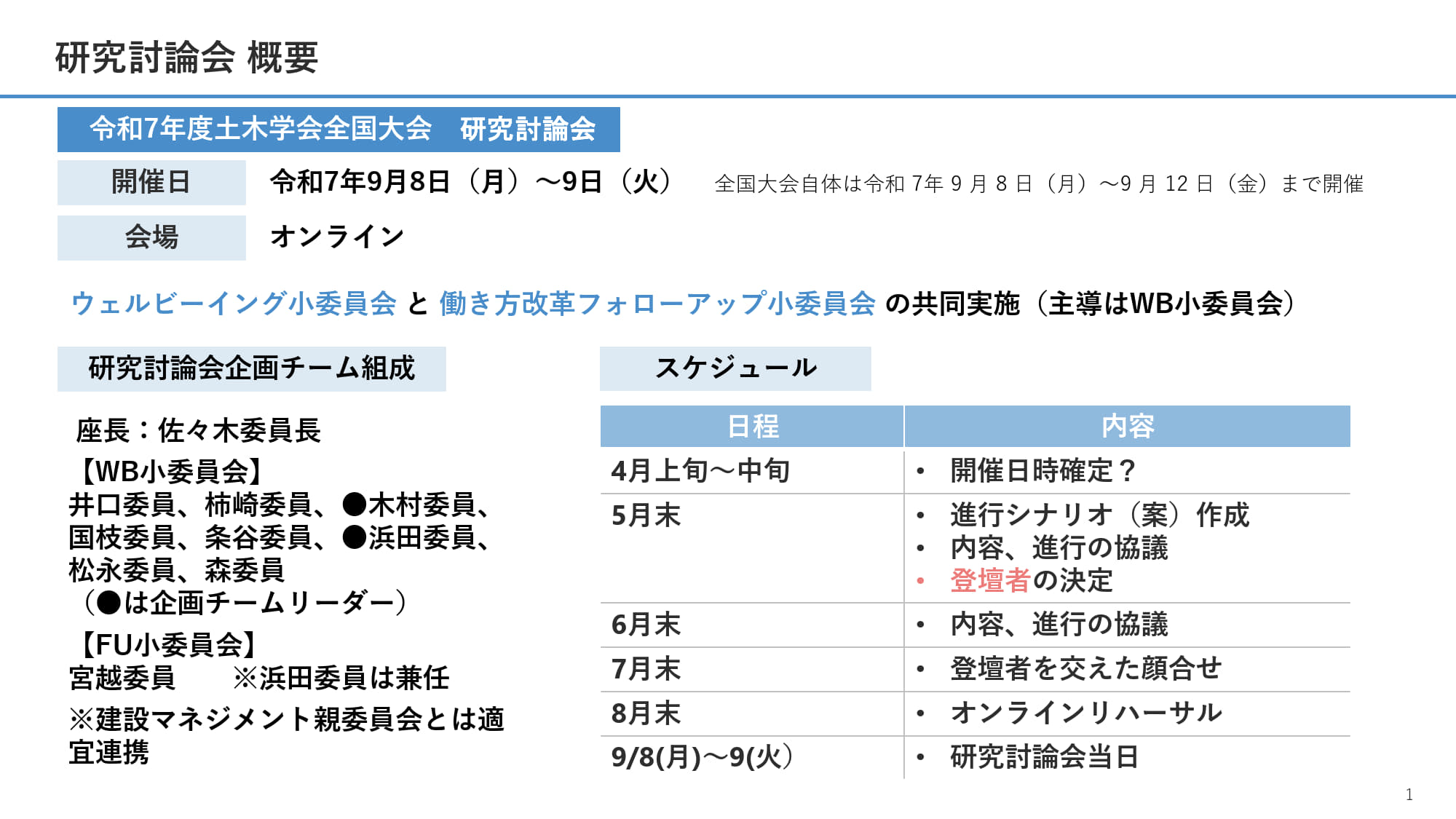 キックオフミーティングを実施し、委員会設置の背景・課題、今後のスケジュールについて共有しました。
