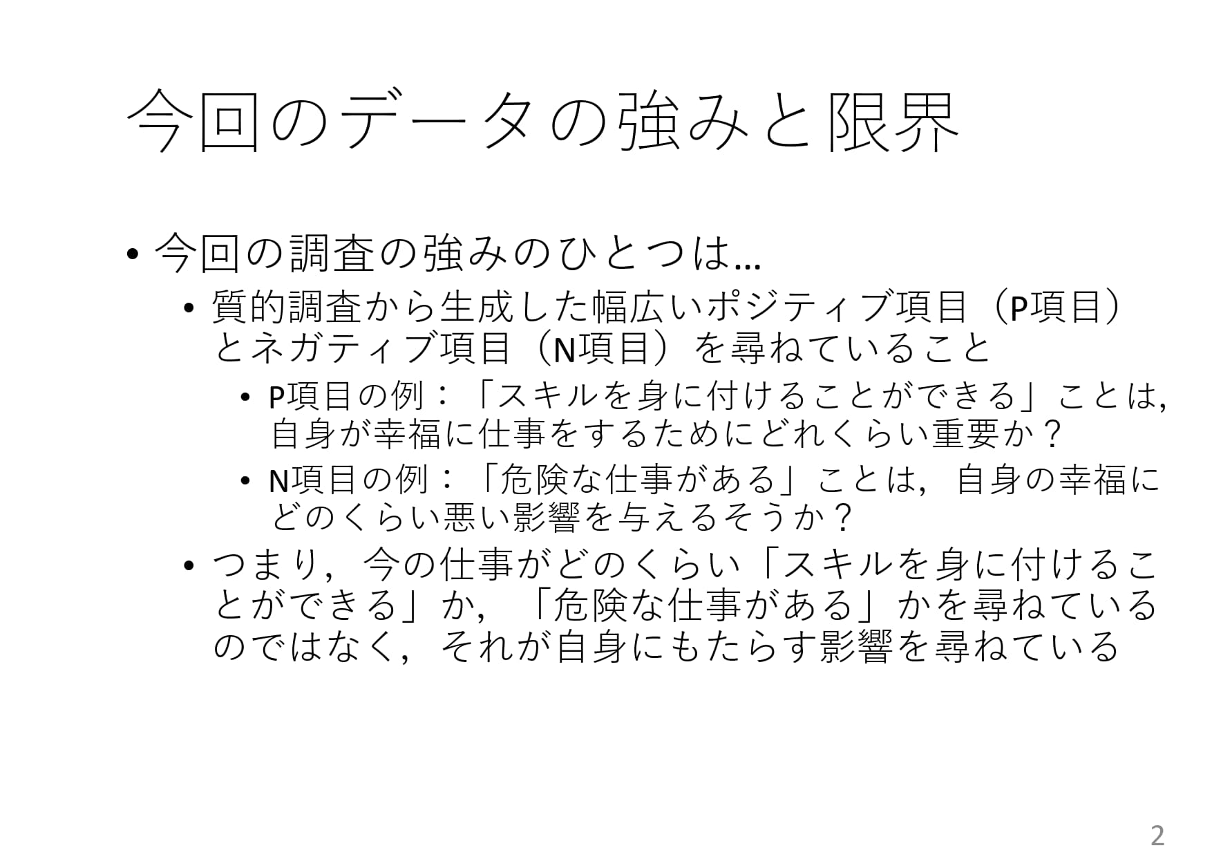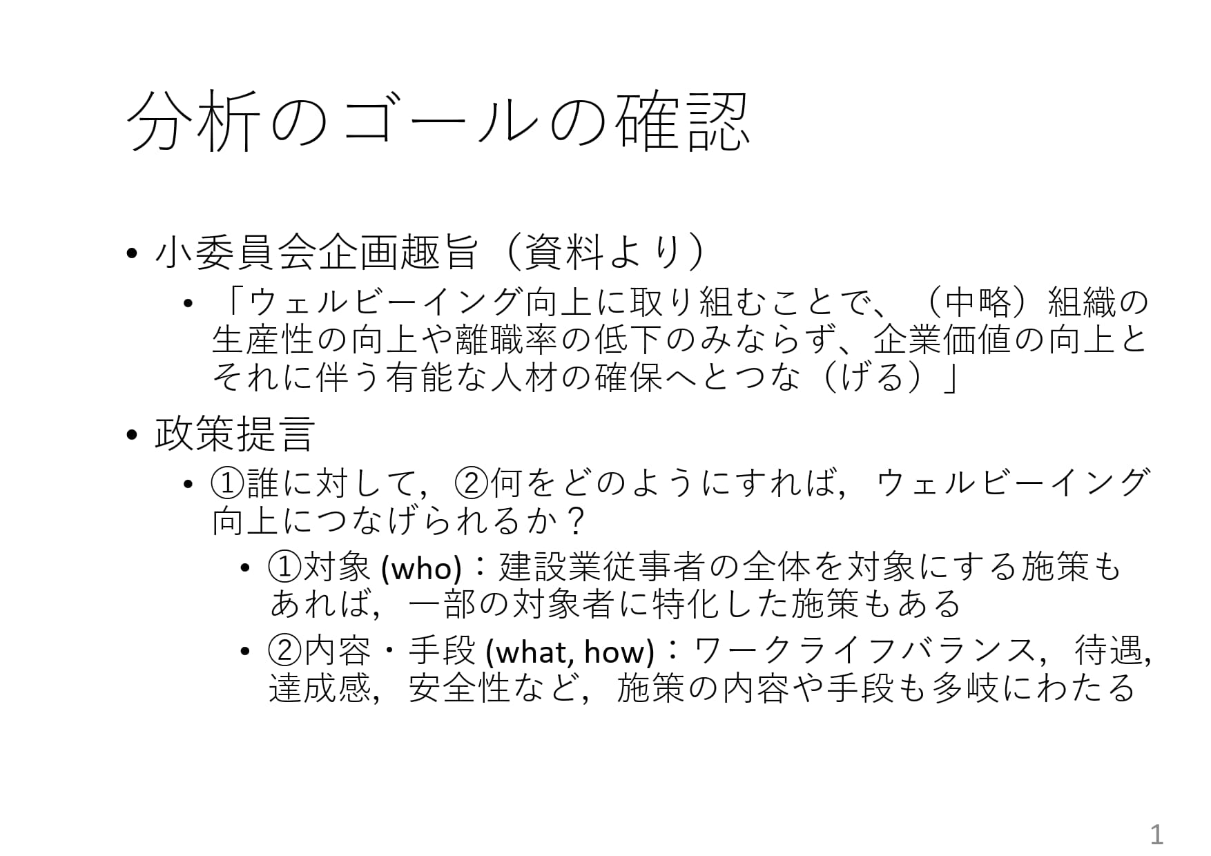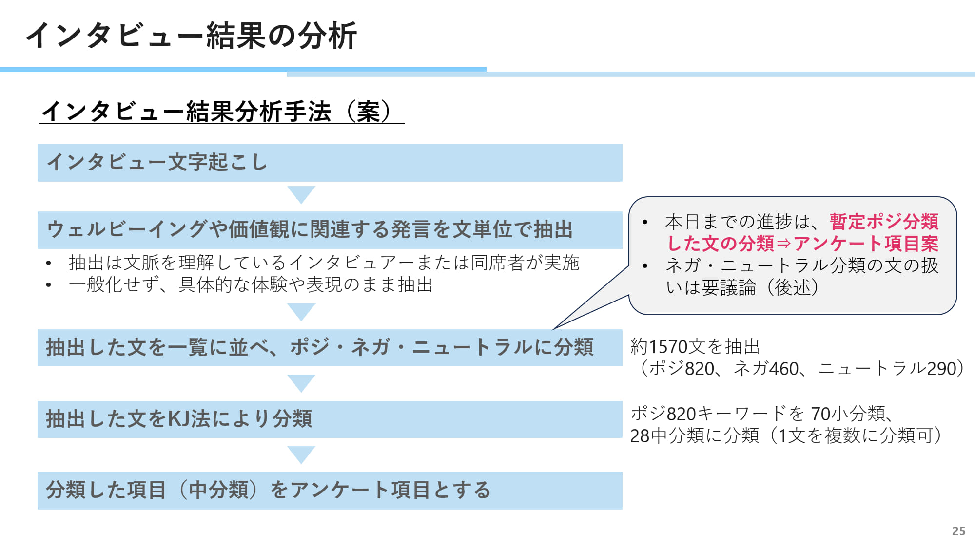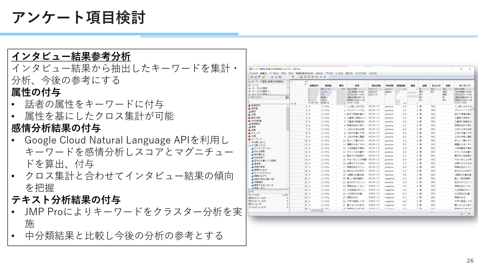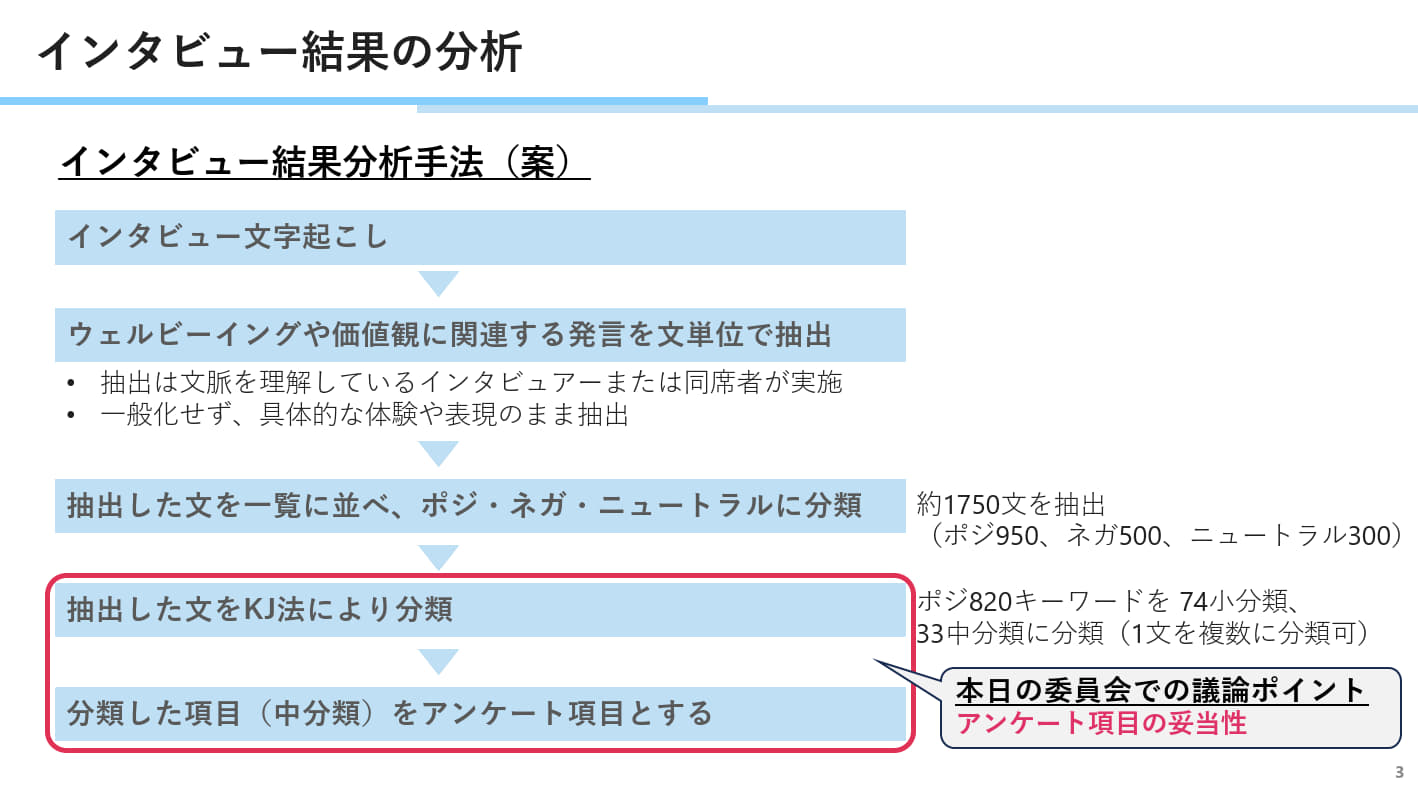 インタビュー結果の分析手法、および今後のアンケート調査手法について議論しました。