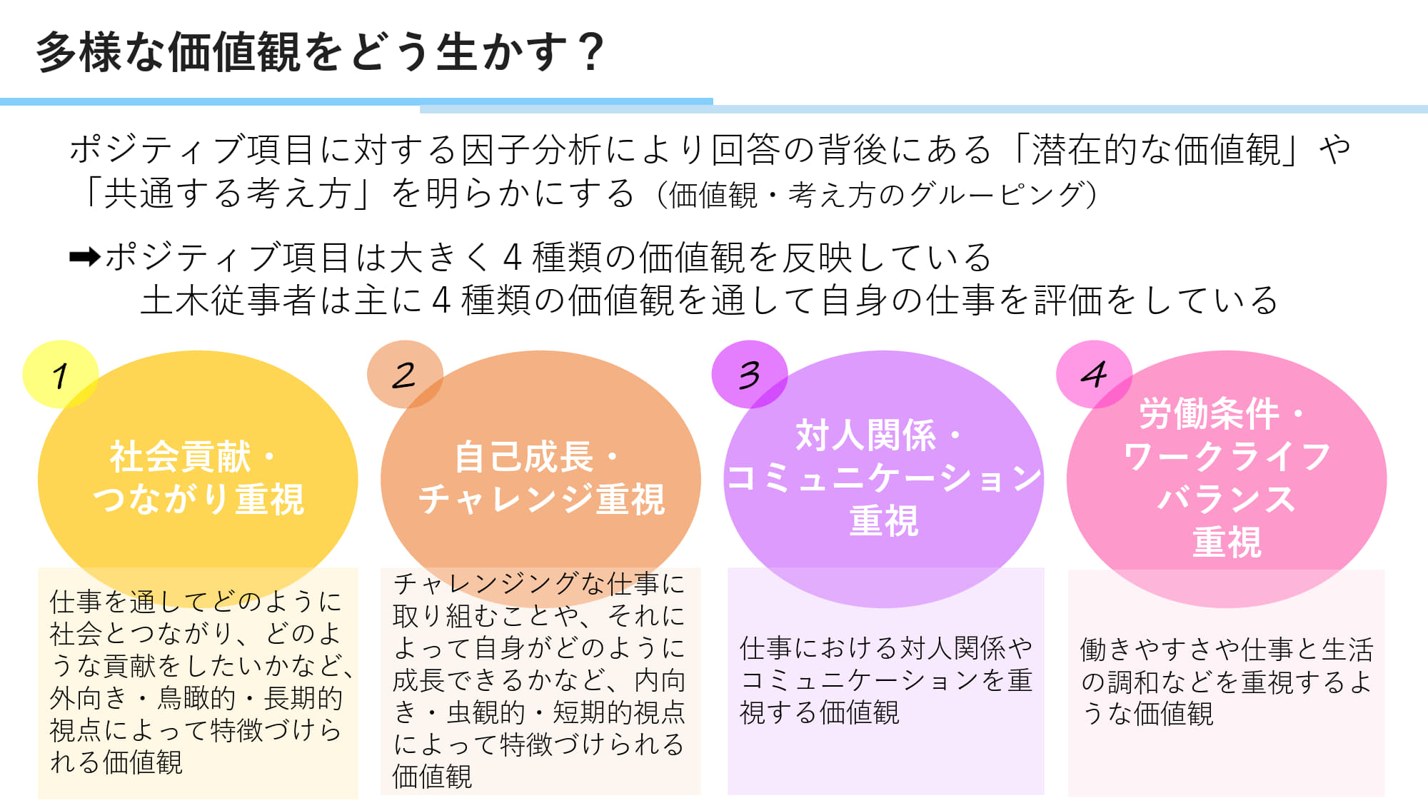 「土木業界におけるウェルビーイング調査研究小委員会」では、現在土木の仕事に従事する方々の幸福感を高めるための施策提案をめざし、調査研究を行っています。その活動の一環として、様々な立場・役割で土木の仕事に従事する方にインタビューとアンケートを行うことで、幸福感に影響する価値観および現状を把握しようと計画しています。今回実施するアンケートでは、土木従事者が仕事に関してどのような観点を重視しているかを主にお尋ねし、この分析結果を施策提案の根拠とします。