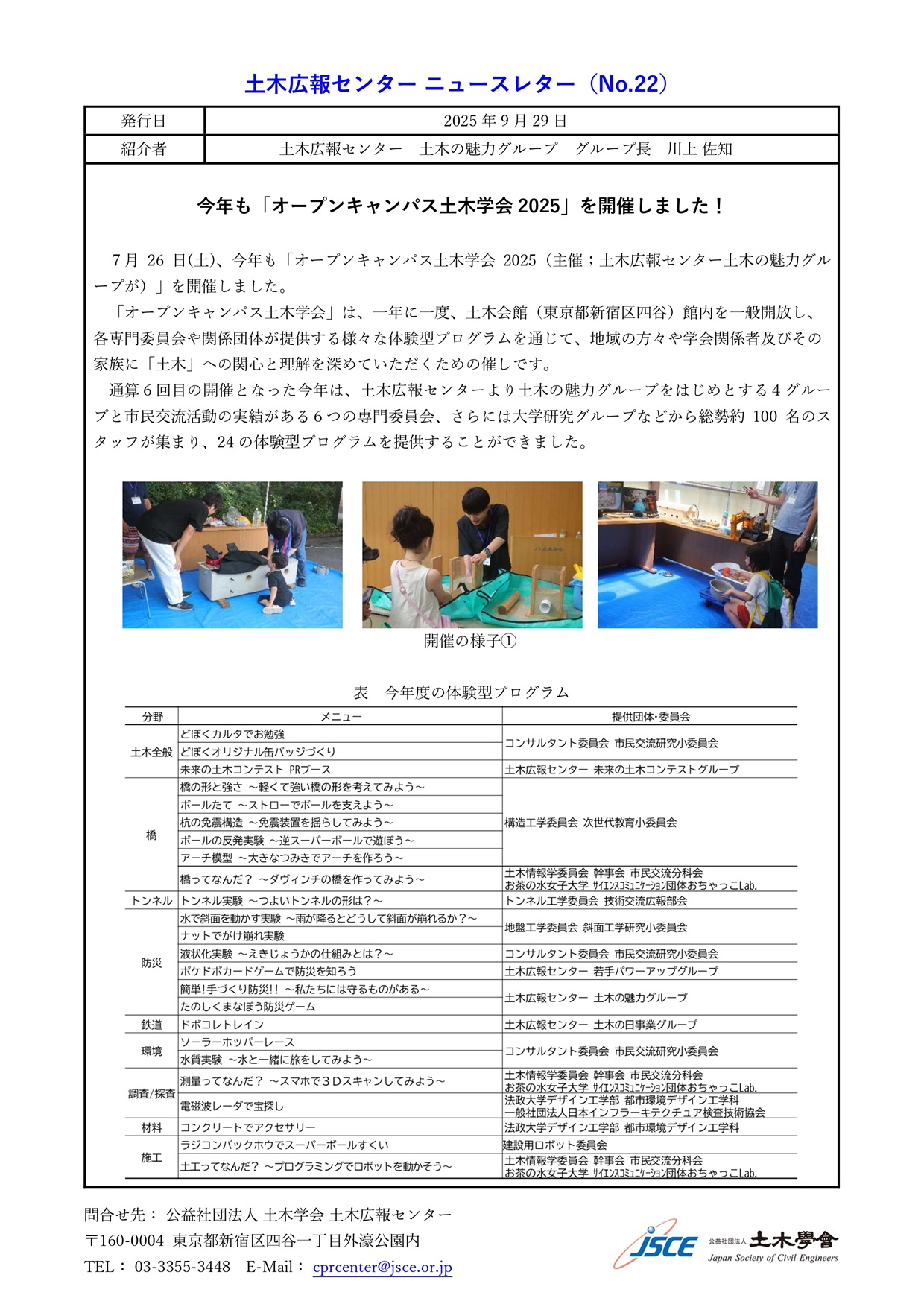 ■発行日:2025年9月29日 ■巻頭言:今年も「オープンキャンパス土木学会2025」を開催しました! ■紹介者:土木学会 土木広報センター 土木の魅力グループ グループ長 川上 佐知 ■掲載内容: 1)全国土木弁論大会2025「有馬優杯」 2)オープンキャンパス土木学会2025 3)ドボクのラジオ(ドボラジ)(2025年1~8月の放送) 4)土木学会WEB情報誌『from DOBOKU』〜土木への偏った愛(2025年1~8月) 5)土木学会Facebookページ いいね!ランキング(2025年1~8月) 6)土木学会Instagramページ いいね!ランキング(2025年1~8月)