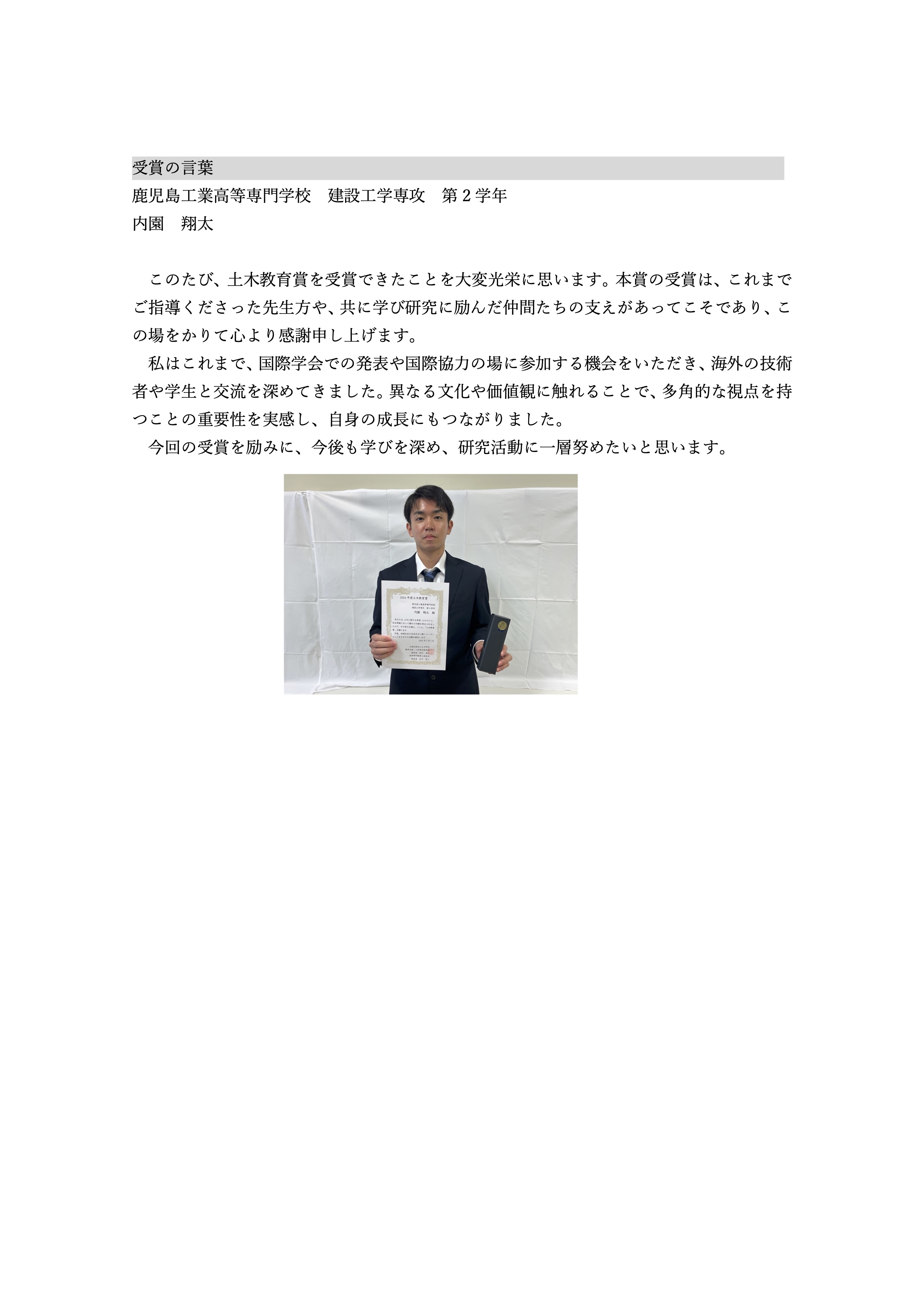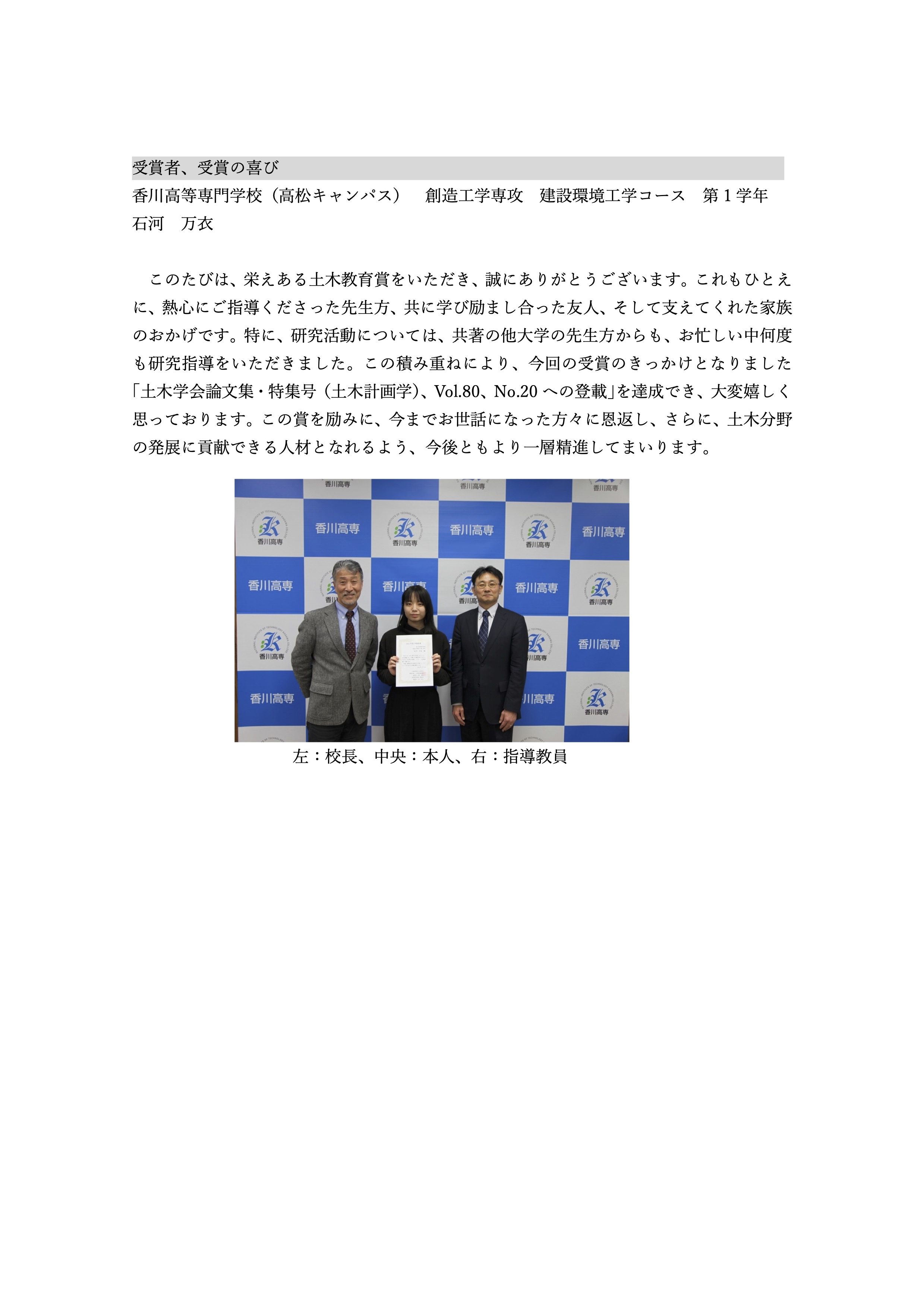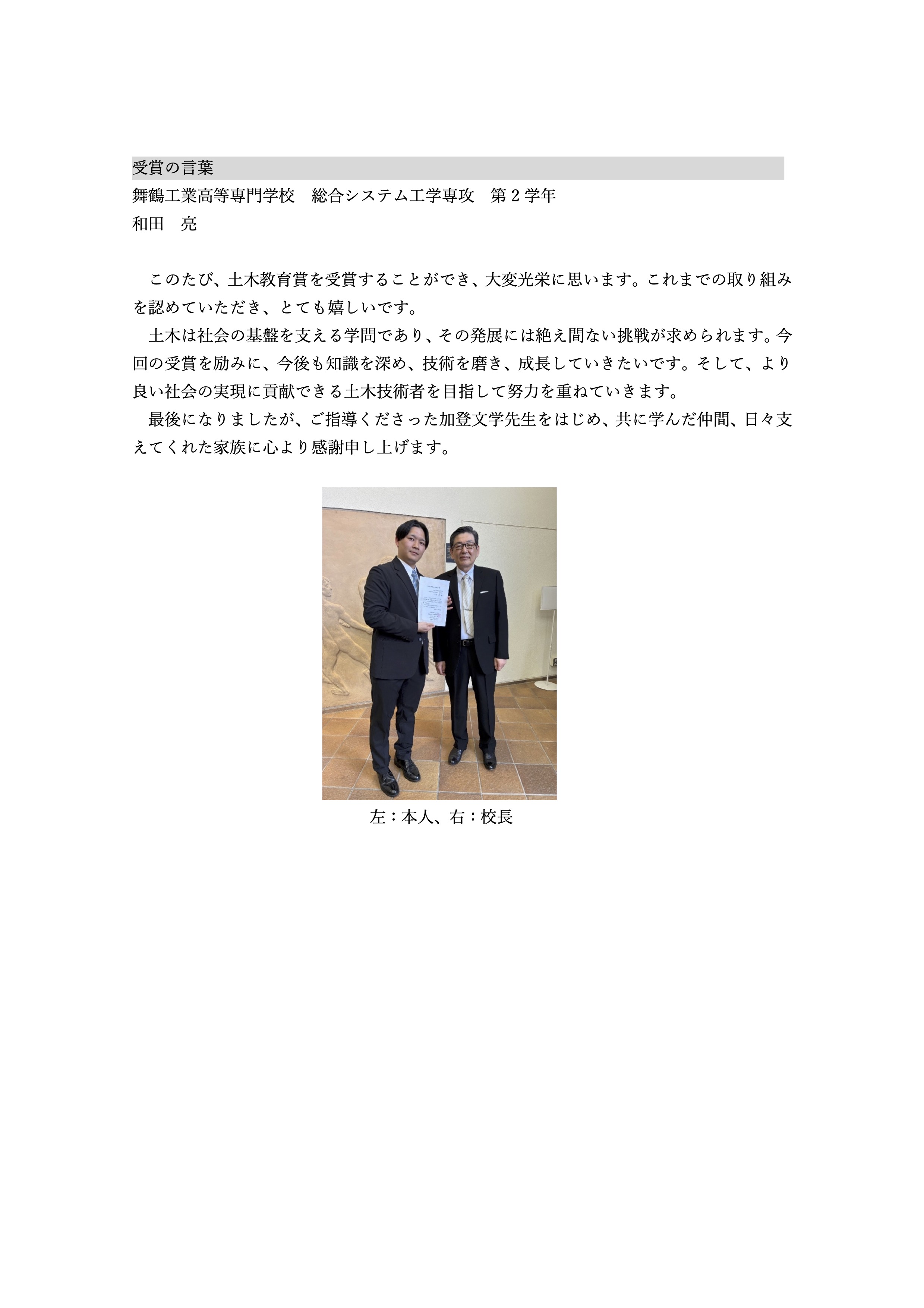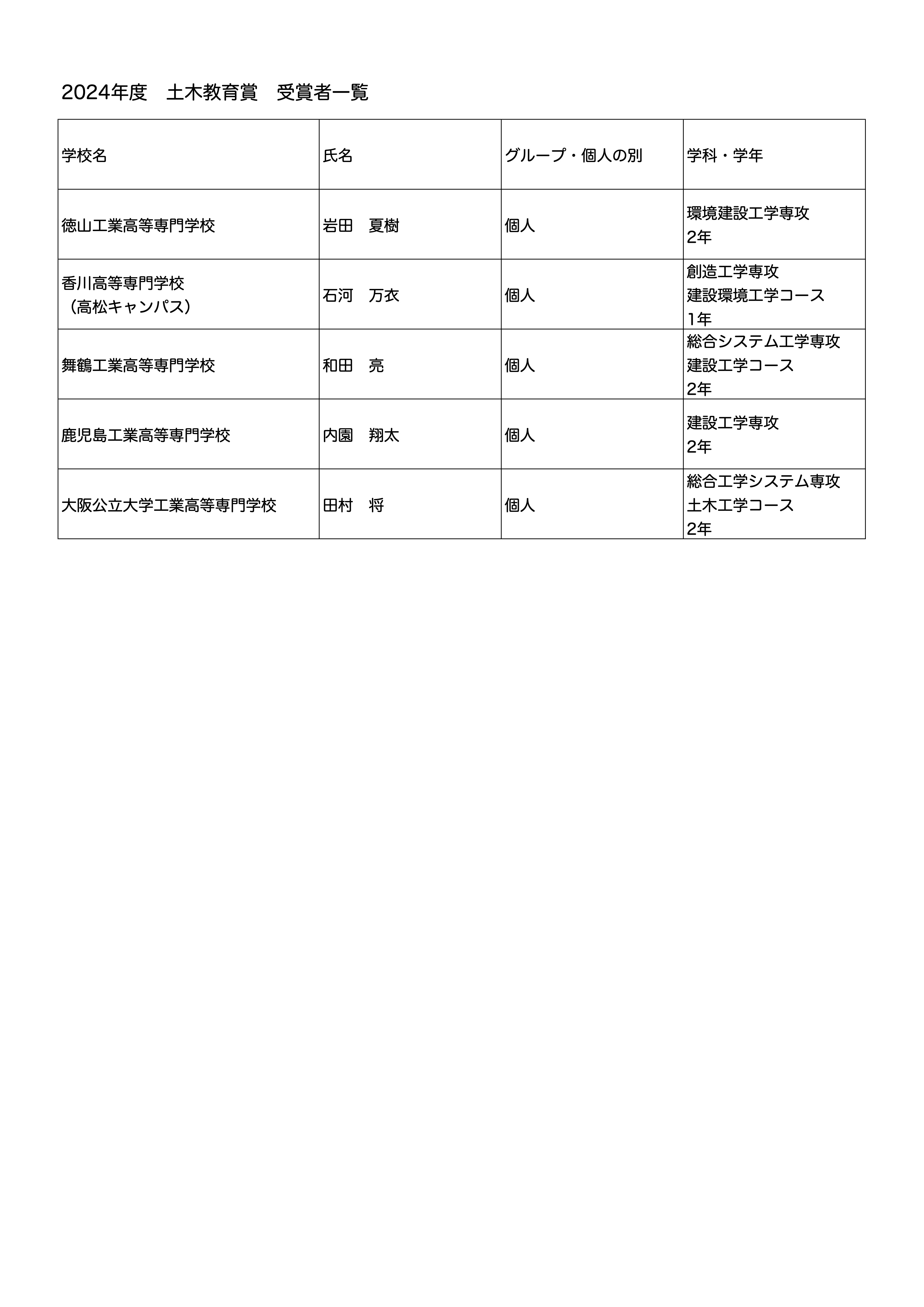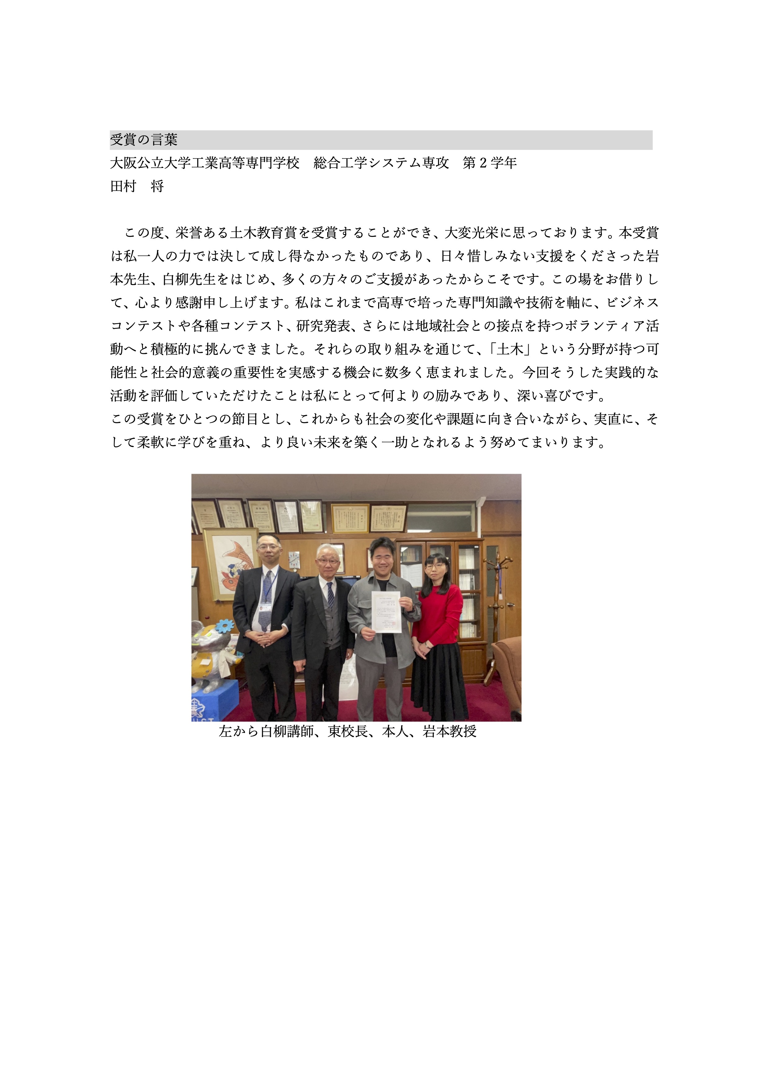 2025年3月3日、5名の学生に対して、2024年度土木教育賞が授与されました。