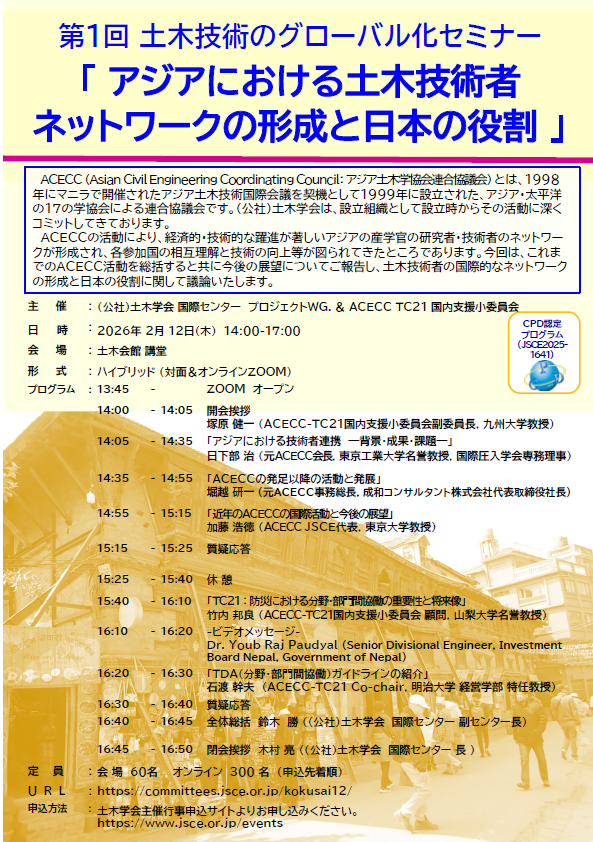 初回は、JSCEが長きにわたりリーダーシップを取り活動を促進しておりますアジア土木学協会連合(Asian Civil Engineering Coordinating Council: ACECC)を 取り上げます。ACECCにはアジアを中心とする土木関連組織組織にて構成されております。そこでは、アジアの産官学の研究者、技術者のプラット―フォームが形成され、技術的交流とともに土木技術の向上とアジア地域のインフラ整備に貢献し続けております。そこにおける日本は貢献度が大きく、さまざま成果を上げております。ACECCの歩みとともに、JSCEの活動と役割をご紹介いたします。